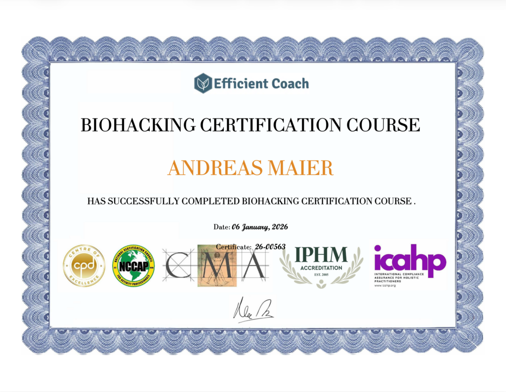 Biohacking ist damit ein strukturierter Weg, den eigenen Körper besser zu verstehen und ihn mit naturheilkundlichen und modernen Mitteln so zu unterstützen, dass Gesundheit, Leistungsfähigkeit und Lebensqualität möglichst langfristig wachsen können.